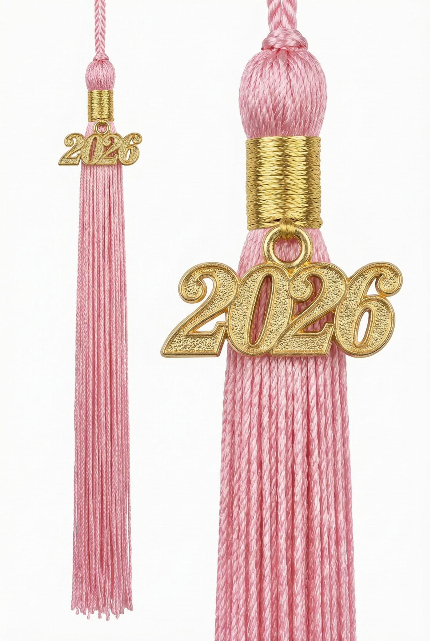 - Borla con colgante del año actual. Incluye una borla decorativa rosa con un elegante colgante dorado que simboliza el final de una etapa educativa.