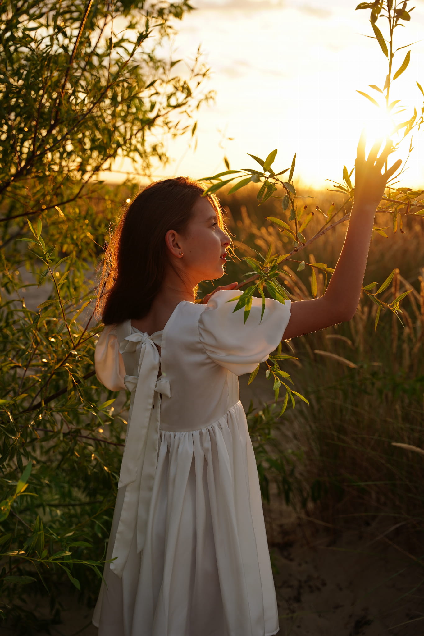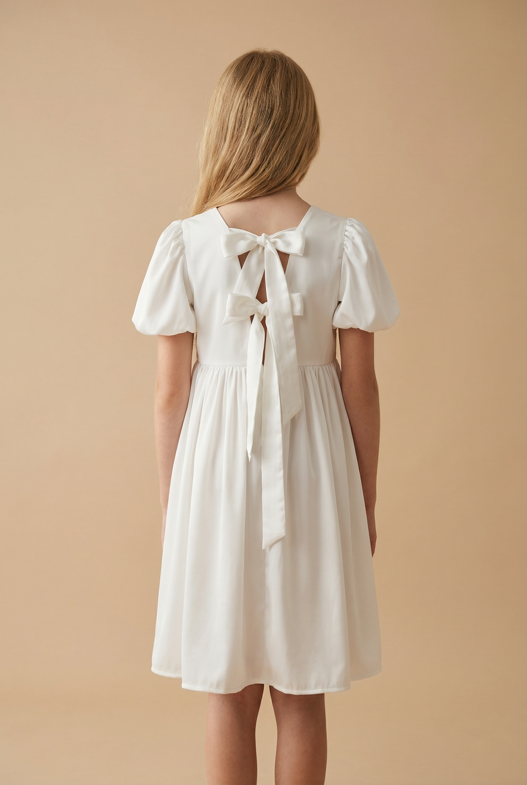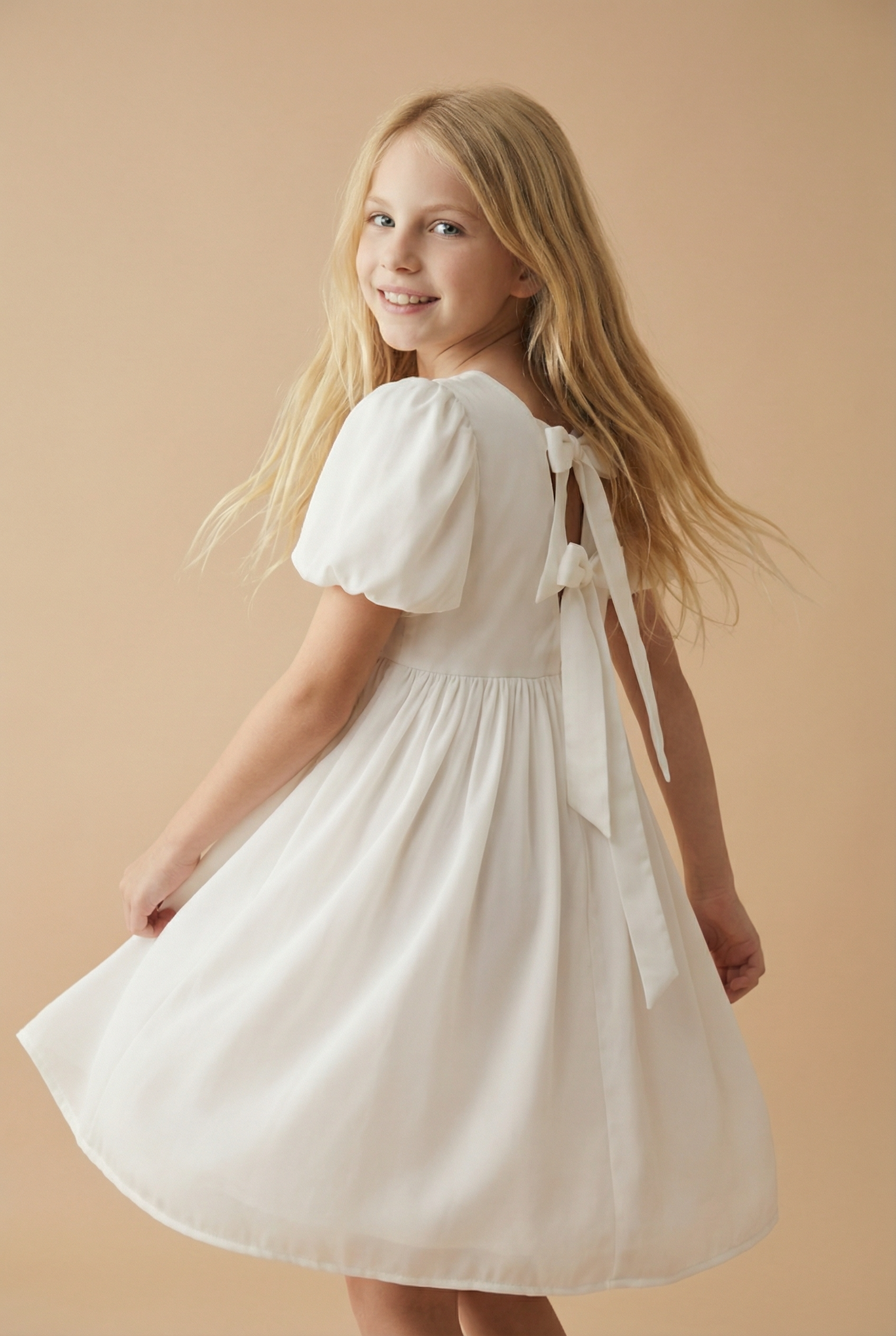 Lo que distingue a la verdadera elegancia es que no necesita estridencias para hacerse notar. El modelo Sia apuesta por un corte acampanado que otorga libertad absoluta de movimiento, permitiendo que su pequeña corra y juegue sin perder ni un ápice de estilo, manteniéndose siempre hecha un pincel. Sus mangas abullonadas aportan ese toque de dulzura clásica y señorial, mientras que la espalda guarda el secreto mejor guardado: dos delicadas lazadas que cierran el vestido con un aire romántico y soñador. Al carecer de forro y estar confeccionado en una sola capa ligera, es la elección predilecta para mantener la frescura y la comodidad durante las celebraciones más cálidas, evitando cualquier pesadez innecesaria.