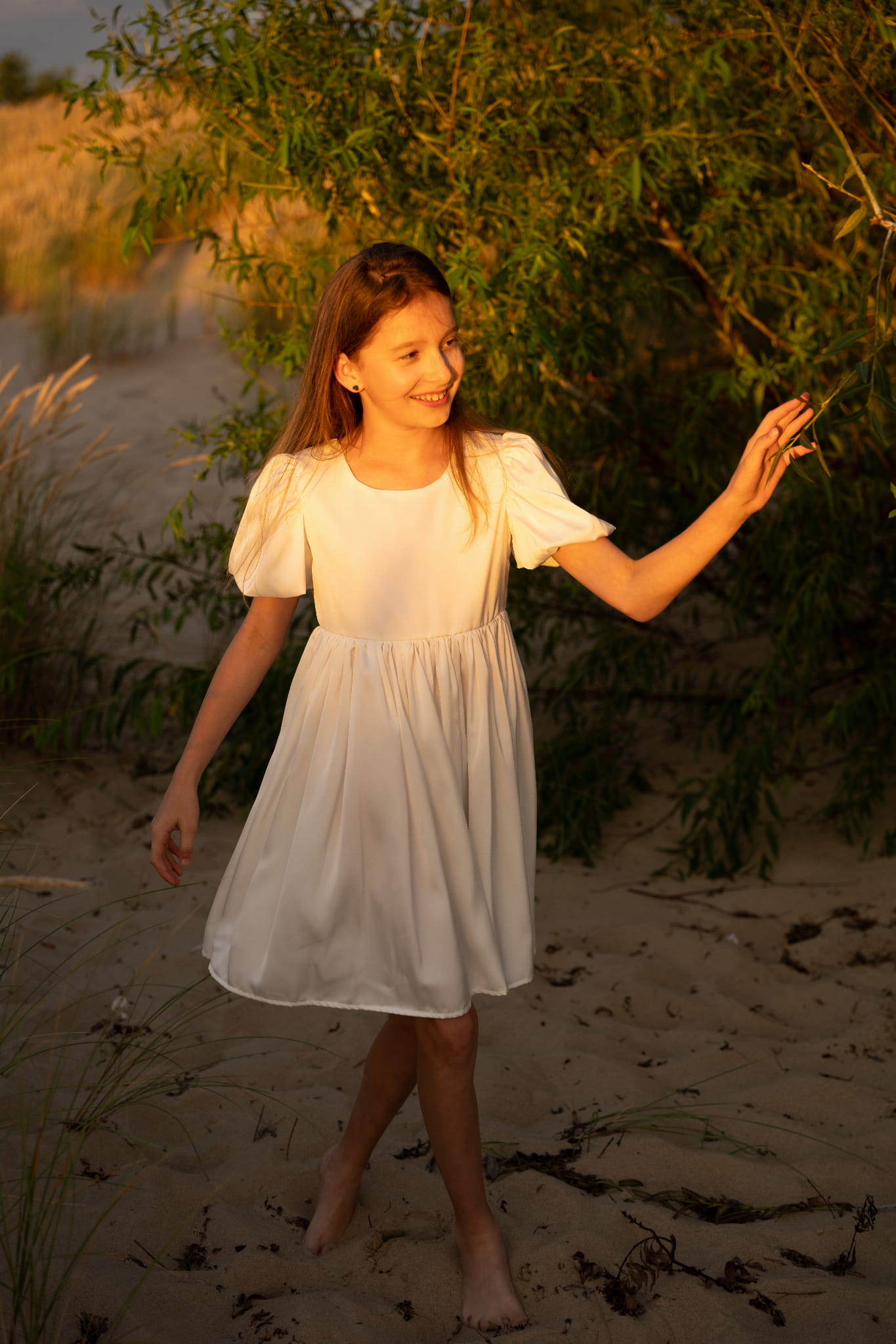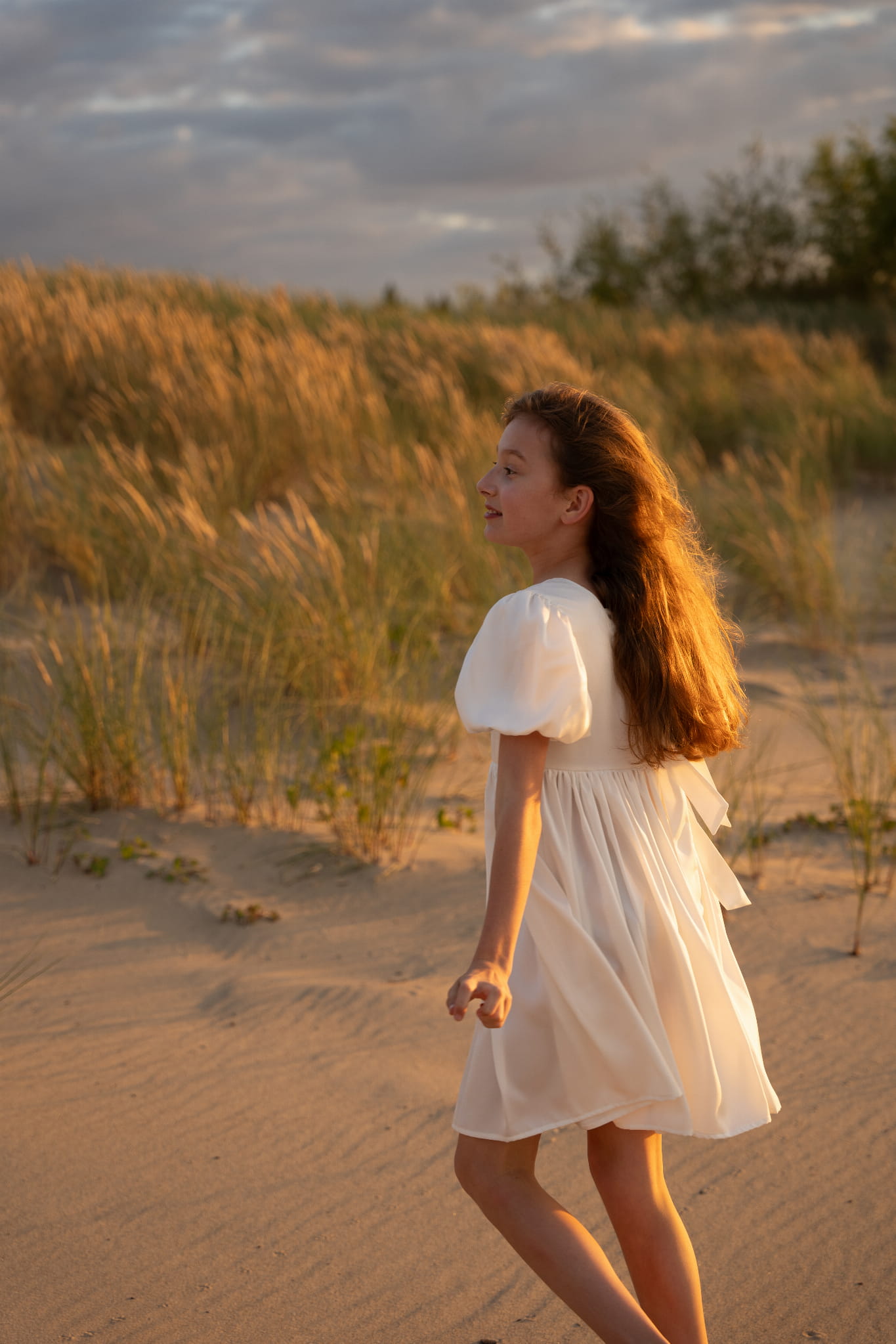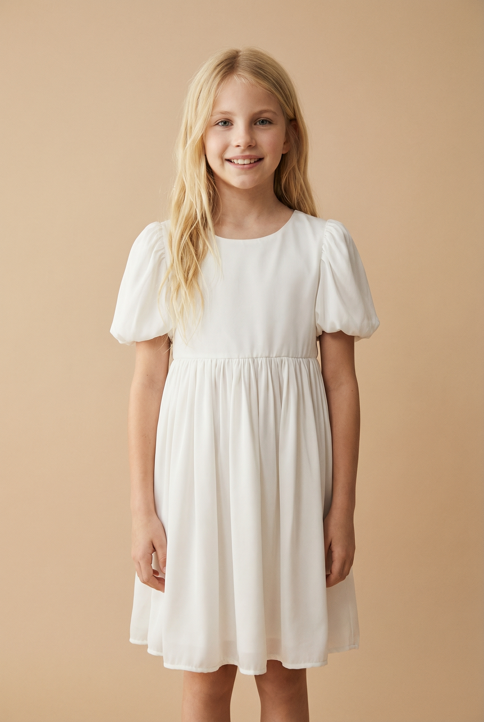Imagine por un instante esa luz especial de las tardes de verano en el Mediterráneo. Esa misma calidez y pureza es la que hemos capturado en el vestido Sia. No es simplemente una prenda; es una invitación a celebrar la infancia de su hija con la distinción que merece. En un tono blanco crema, suave como la nata, este diseño evoca la nostalgia de los veranos de antaño, pero con una frescura absolutamente contemporánea. Es el lienzo perfecto para que la personalidad de su pequeña brille con luz propia.